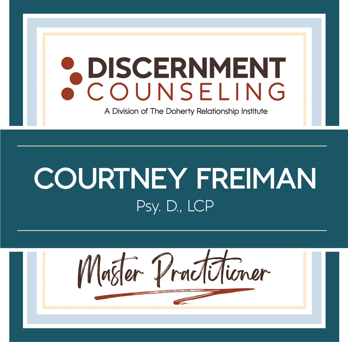 Hi! I'm Courtney, a licensed clinical psychologist, certified Discernment Counselor, and current resident in the advanced training program to become a Master Practitioner in Discernment Counseling. I run a group private practice in the D.C. area that works with adults and couples—and over time, discernment counseling has become the heart of what I do.